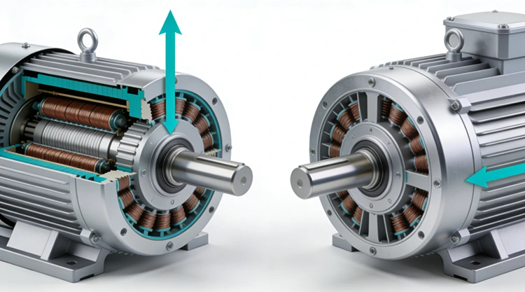 軸方向磁束 (左) 対 径方向磁束 (右) の断面図